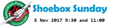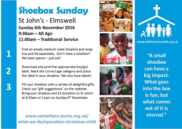 We will be collecting packed shoeboxes at our special Mission Focus services on 6 November.