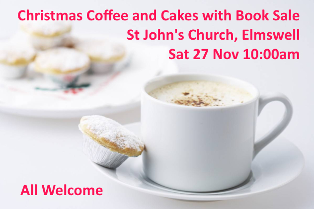 As we are unable to have our usual Christmas Fair this year, you are warmly invited to come to a Coffee and Cake morning at St John's on Saturday 27 November from 10:00am There will be yummy cakes, mince pies on sale to eat in or take home and a range of second hand books.